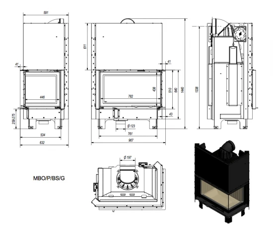 Eck-Kamineinsatz Kratki MBO/P/BS/G 15 mit Schiebetür und Seitenscheibe rechts
