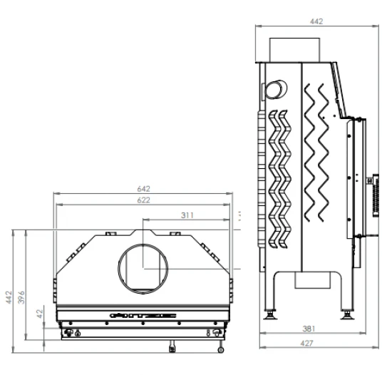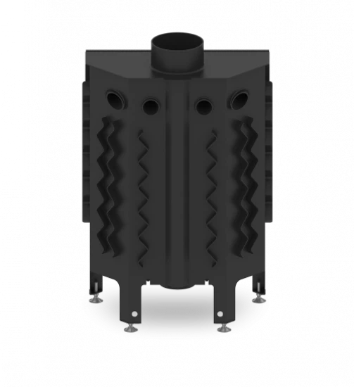 – Kaminkörper (zusätzlich verstärkt mit Rippen) und Kaminfront aus massivem Kesselstahl